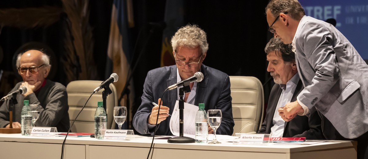 Martín Kaufmann y Alberto Sileoni firmaron un convenio de co - edición del libro Pensamiento Pedagógico Latinoamericano. Gracias a este acuerdo, la obra que forma parte del proyecto Pensar en Movimiento, de la UNTREF, será distribuida gratuitamente en instituciones de educación arraigadas en territorio bonaerense. La firma se dio ante 400 personas en el marco del “Primer Encuentro Pensamiento Pedagógico Latinoamericano”, actividad que reunió a profesionales de la Educación y a reconocidos intelectuales que pregonan la promoción de un discurso decolonial